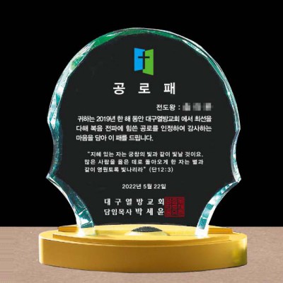 대구열방교회 공로패 크리스탈감사패 상패제작 송공패 수료패