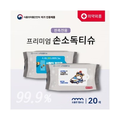 손소독티슈 청색 부직포 20매 99.9% 살균 손 피부 인쇄 제작